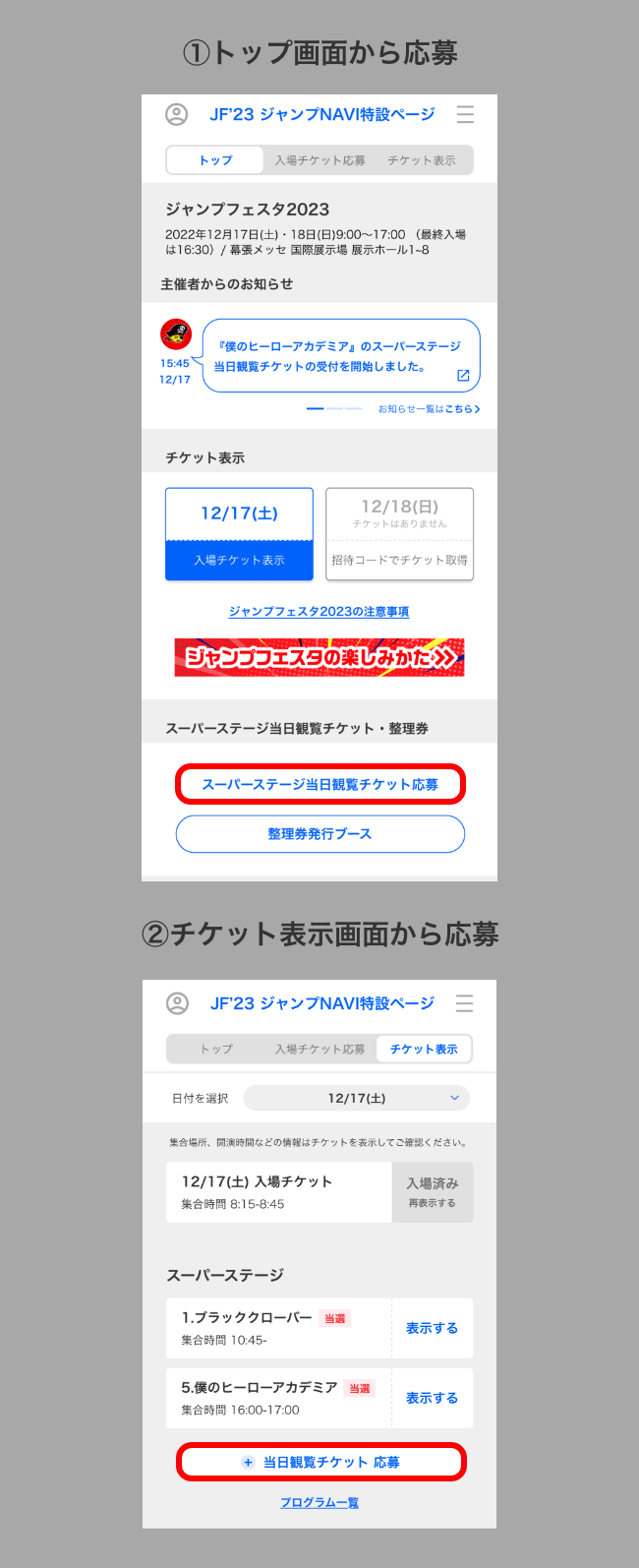 ジャンプフェスタ当日、入場後に抽選制の「スーパーステージ当日観覧チケット」に応募*ができます。 各プログラムの開演75分前〜45分前に応募ができます。