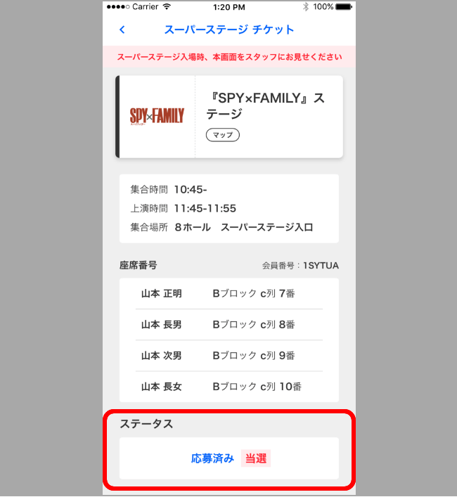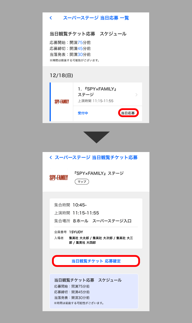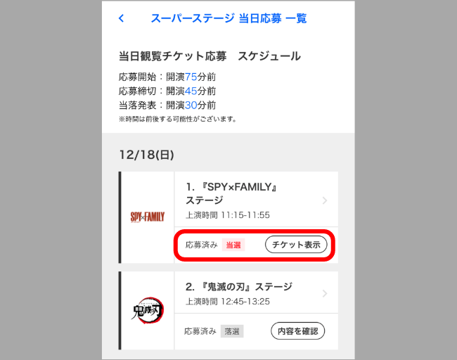 ・「スーパーステージ 当日応募 一覧」画面のステータスが『当選』となった場合のみ、対象プログラムの観覧が可能です。