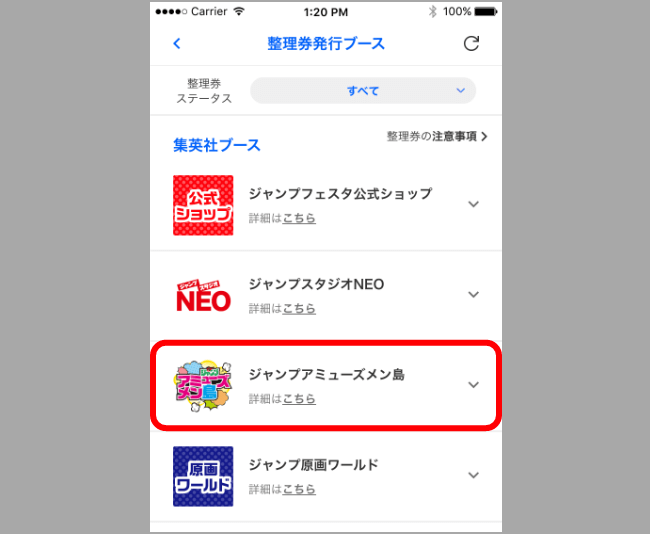 整理券は、整理券発行ブース画面の「アミューズメン島」から取得できます。