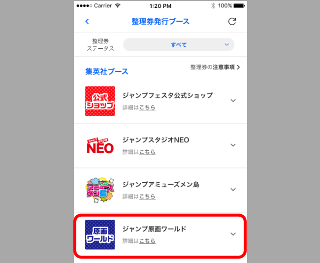 整理券は、整理券発行ブース画面の「ジャンプ原画ワールド」から整理券配付中に限り取得できます。 整理番号のお呼び出し後、60分が経過した場合失効とさせていただきます。
