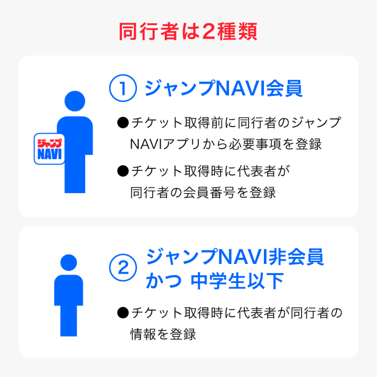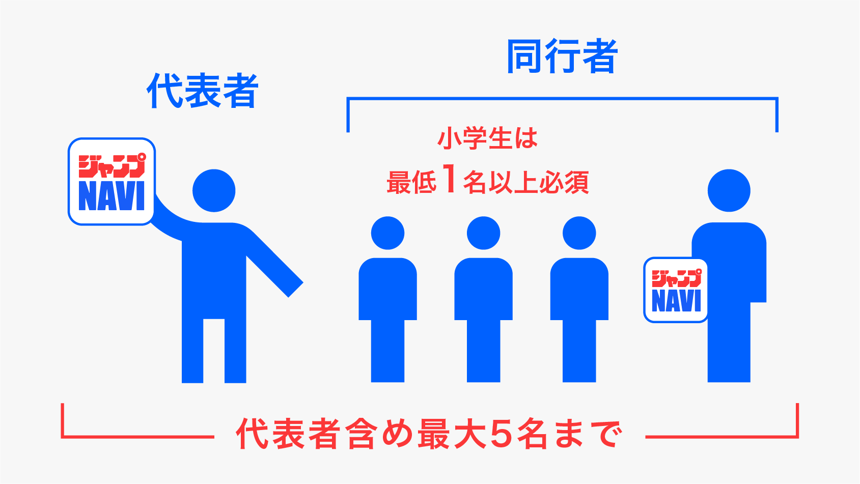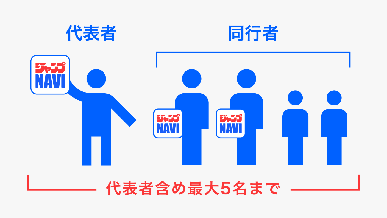 グループでチケットを取得する場合は同行者登録が必要です。18歳以上のジャンプNAVI会員の方 1名を代表者として登録してください。代表者含め最大5名*まで登録が可能です。