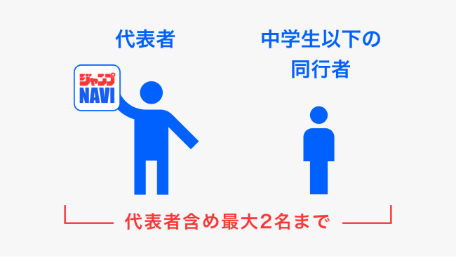 ※18歳以上(ジャンプNAVI会員)の同行者は、13歳未満の同行者人数に関わらず1名まで。