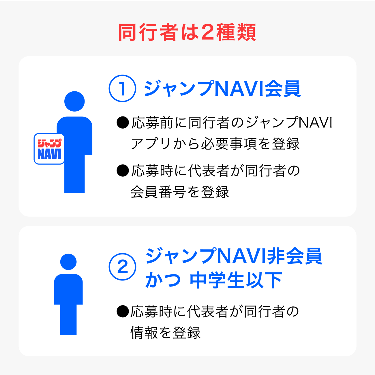 グループでチケットを応募する場合は同行者登録が必要です。ジャンプNAVI会員の方